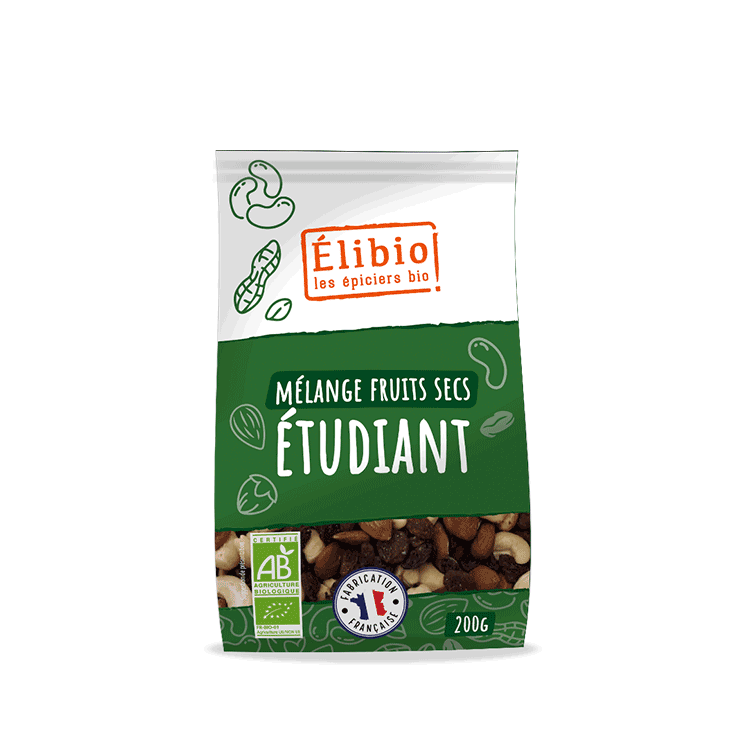 Mélangé en France à partir de fruits secs 100 % bio, notre mélange étudiant Elibio combine le croquant des noix et amandes à la douceur des raisins, figues et abricots, relevé d’une touche acidulée de cranberries.